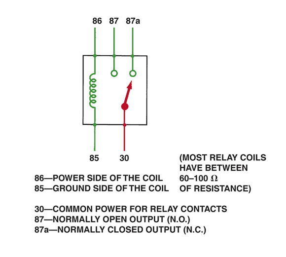 Looking at the diagram, we see the pinout of a typical 12V relay. Note that each pin is numbered. 85 and 86 are the coil pins while 30, 87, and 87a are the contact pins.